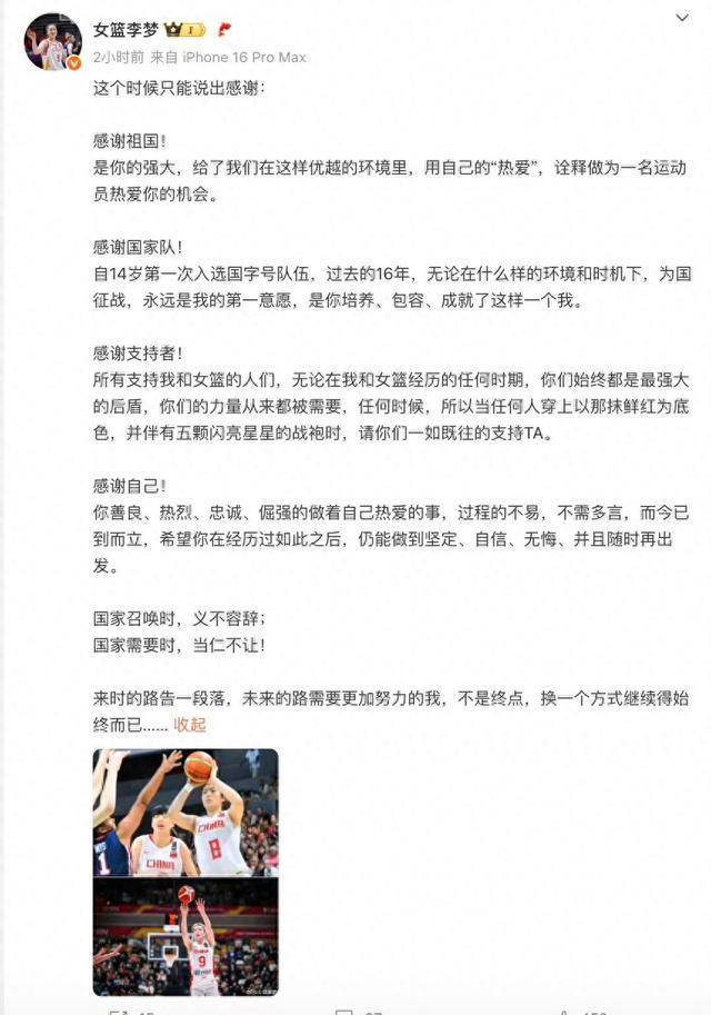 16日早,李梦发布长文,向国度、球迷及总共撑捏者致谢。她在文中写谈:“国度召唤时,义艰涩辞;国度需要时,当仁不让!昔日的阶段告一段落,改日的路需要更竭力的我方——这不是绝顶,仅仅换一种方法不绝谨守初心……”