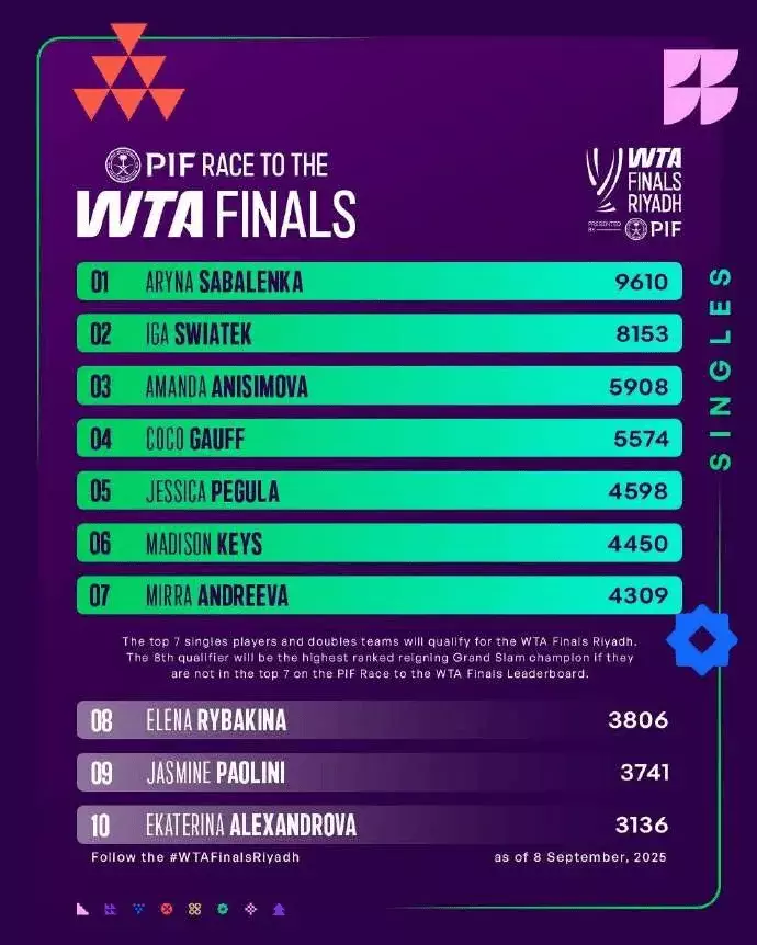 WTA官方当天公布最新一期迈向总决赛积分榜,萨巴伦卡9610分高居榜首。